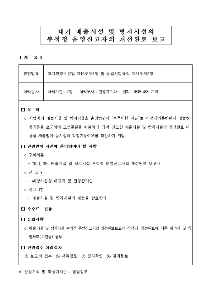 대기배출시설 및 방지시설의부적정운영신고자의개선완료보고