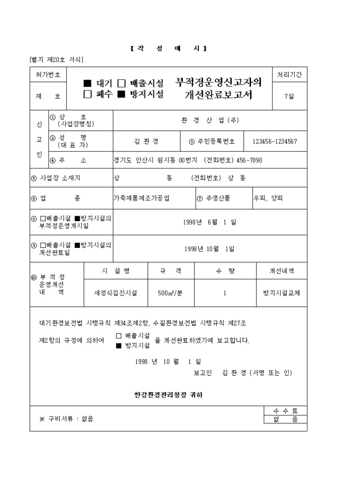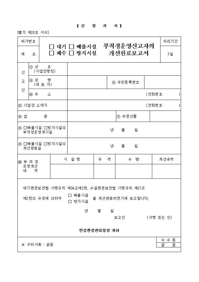 대기환경보전법 시행규칙 제34조제2항, 수질환경보전법 시행규칙 제27조 제2항의 규정에 의하여 배출시설, 방지시설을 개선완료하였기에 이를 보고할 시 사용하는 양입니다.