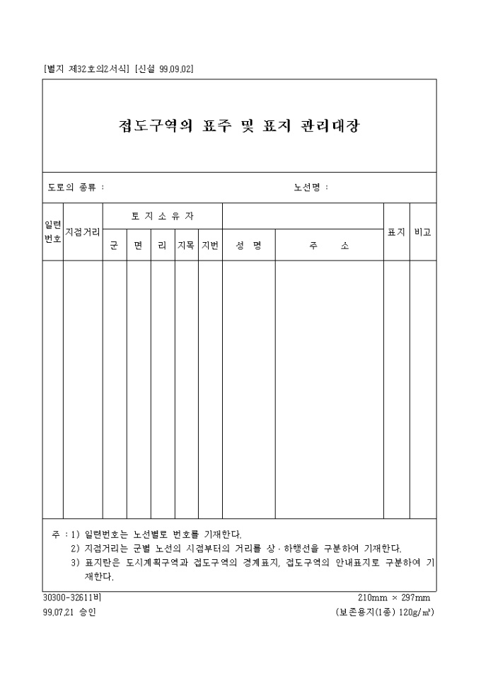 도로법시행규칙32의02서식(99.07.21)-접도구역의표주및표지관리대장 입니다.