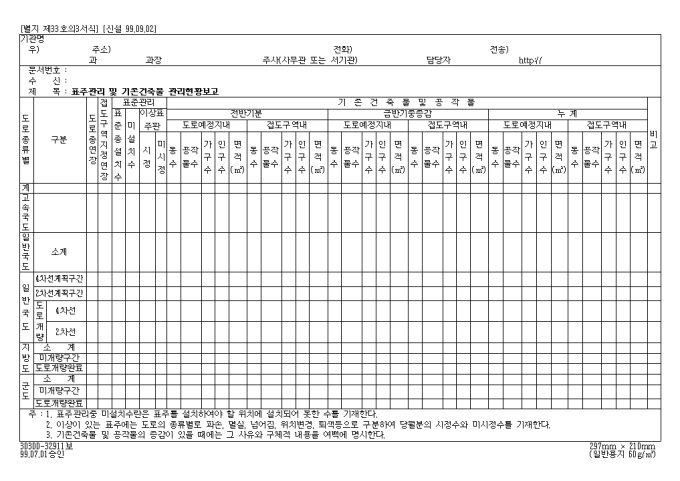 도로법시행규칙33의03서식(99.07.21)-표주관리및기존건축물관리현황보고 입니다.