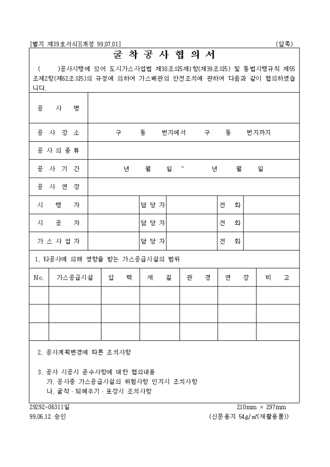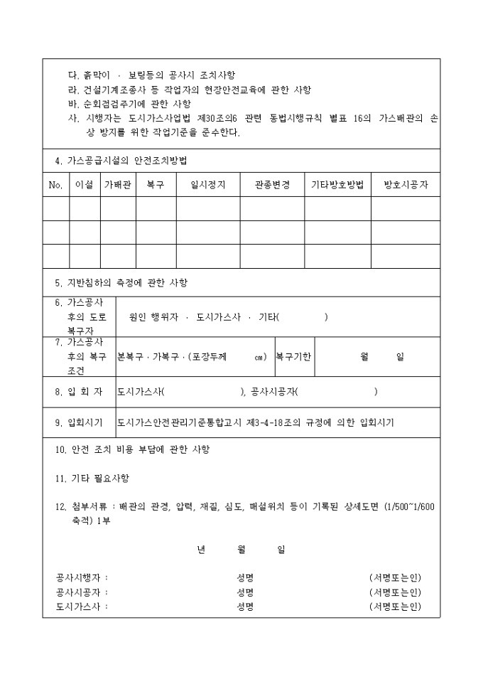 도시가스사업법 제30조의5제1항(제39조의5) 및 동법시행규칙 제55조제2항(제62조의5)의 규정에 의하여 가스배관의 안전조치에 관하여 굴착공사 협의시 사용하는 양식입니다.