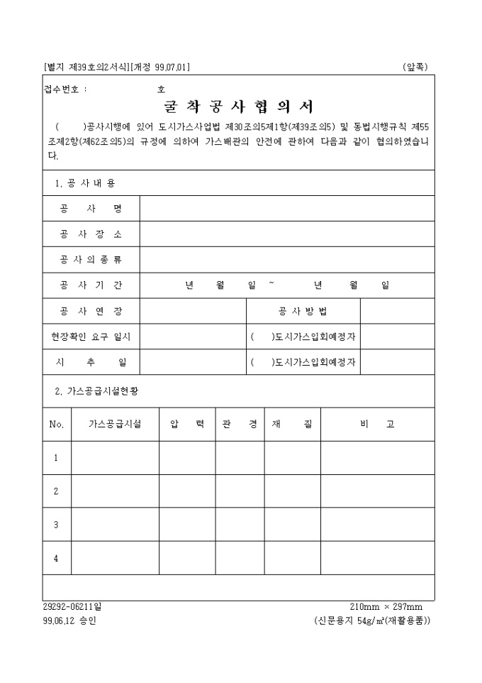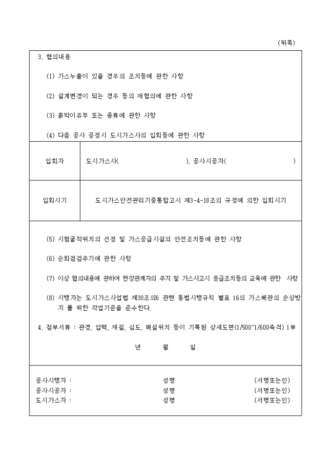 도시가스사업법 제30조의5제1항(제39조의5) 및 동법시행규칙 제55조제2항(제62조의5)의 규정에 의하여 가스배관의 안전에 관하여 굴착공사협의시 사용하는 양식입니다.