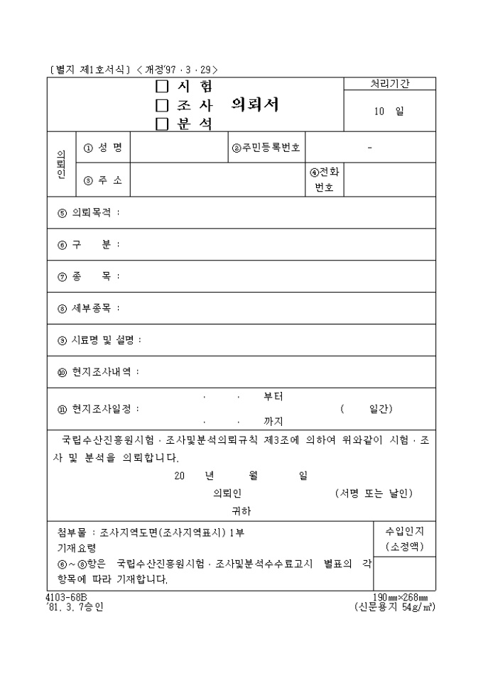 9,000원/월별지 제1호서식 국립수산진흥원시험·조사및분석의뢰규칙 제3조에 의하여 시험·조사 및 분석을 의뢰할 때 사용하는 양식입니다.