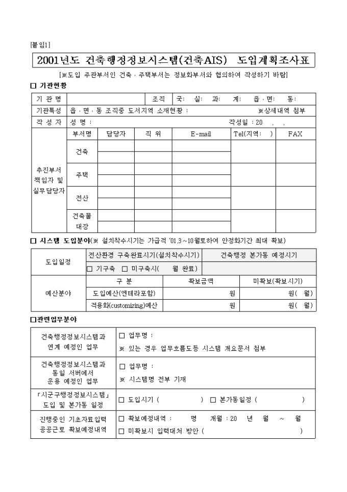 기관현황, 시스템 도입분야, 관련업무분야 , 전산환경분야등으로 구성된 건축행정정보시스템 도입계획 조사표 양식입니다.