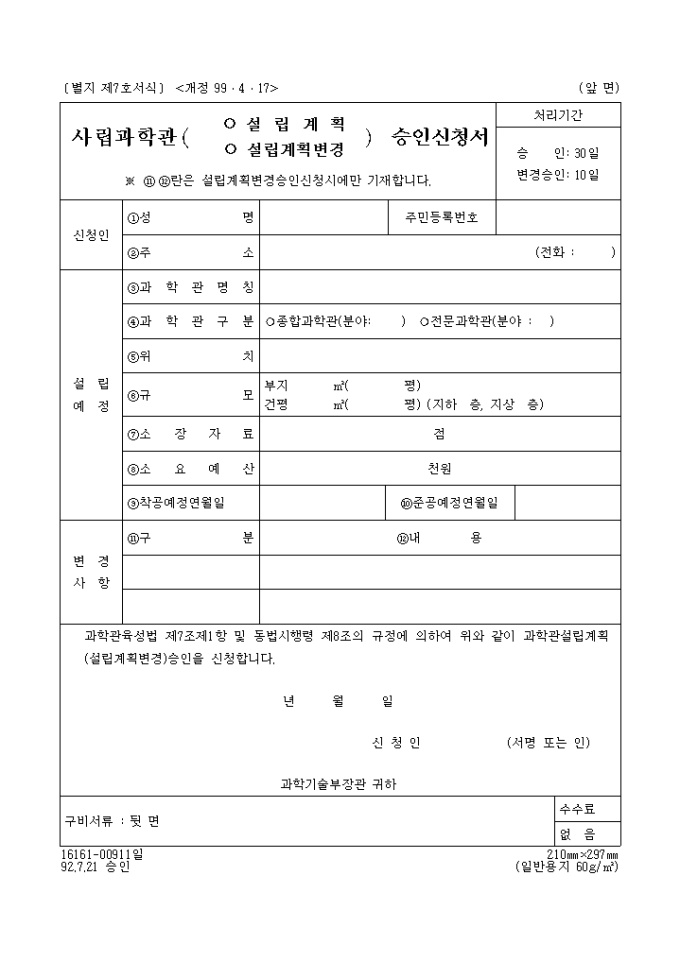 사립과학관, 기업등부설과학관(설립계획, 설립계획변경)승인신청서