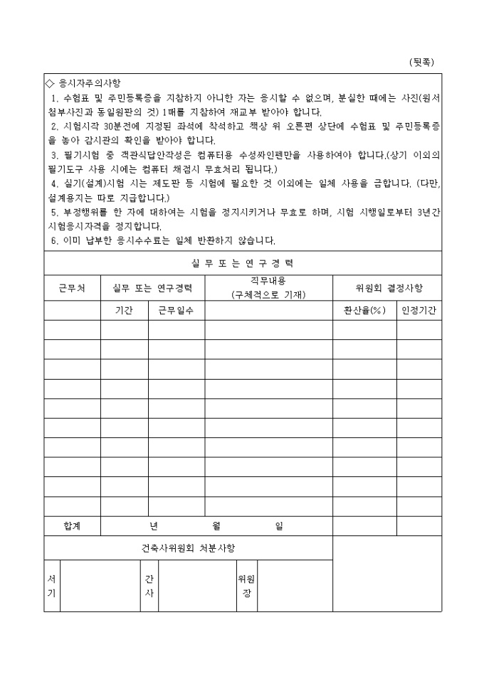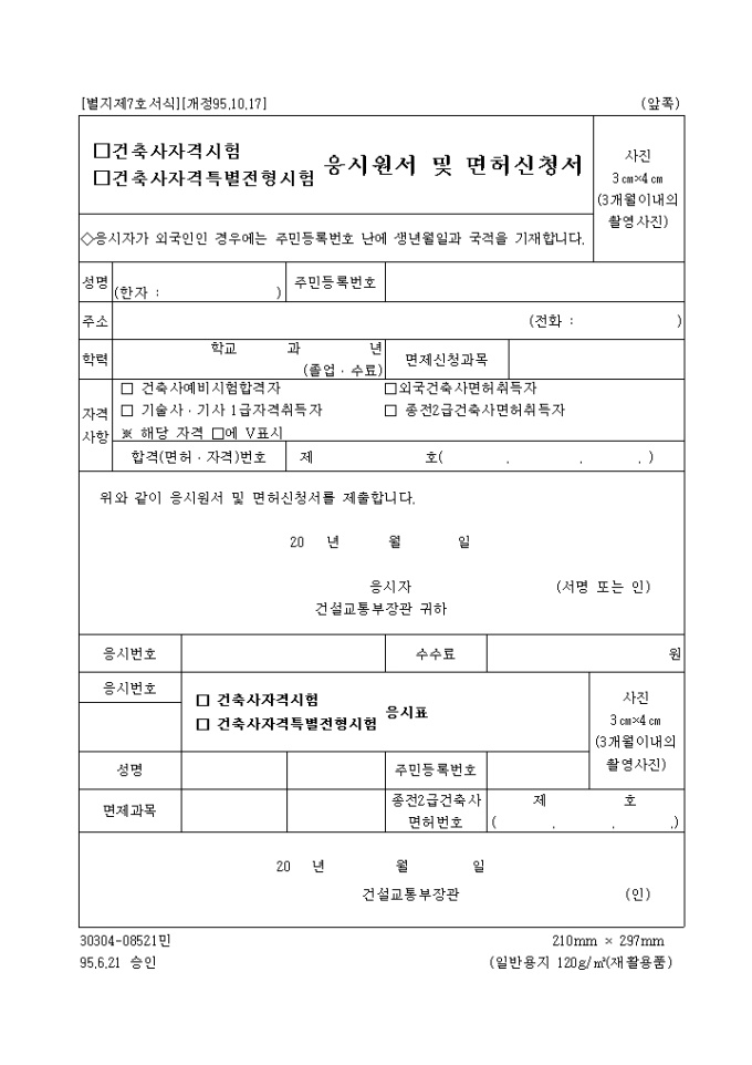 건축사자격시험, 건축사자격특별전형시험)응시원서 및 면허신청서
