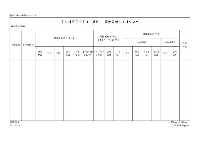 행정구영, 고시면적, 목적과 다른 이용현황, 다른 법령에 의한 지역지구, 구획설치현황, 개발계획수립현황, 조치계획등의 내용으로 구성되어 있습니다.