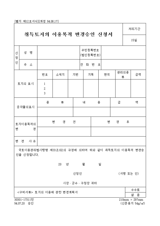 국토이용관리법시행령 제33조의2의 규정에 의하여 취득토지의 이용목적 변경승인을 신청할 때 사용하는 양식입니다.