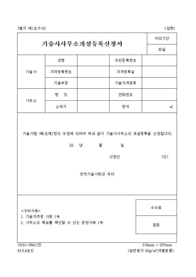 기술사사무소개설 등록 신청서
