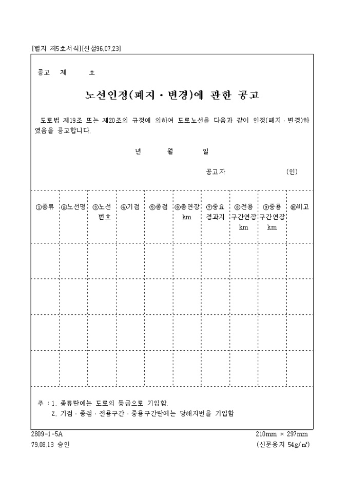 도로법시행규칙05서식(79.08.13)-노선인정(폐지/변경)에관한공고 입니다.