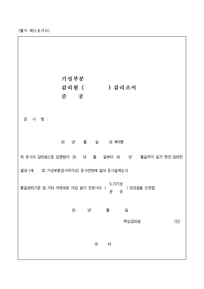 위 공사의 감리원으로 임명받아 20 년 월 일부터 20 년 월일까지 실지 현장 감리한 결과 (제 회 기성부분검사까지의) 공사전반에 걸쳐 공사설계도서, 품질관리기준 및 기타 약정대로 어김 없이 전공사의 ( % 가기성 ,준공 ) 되었음을 인정함.