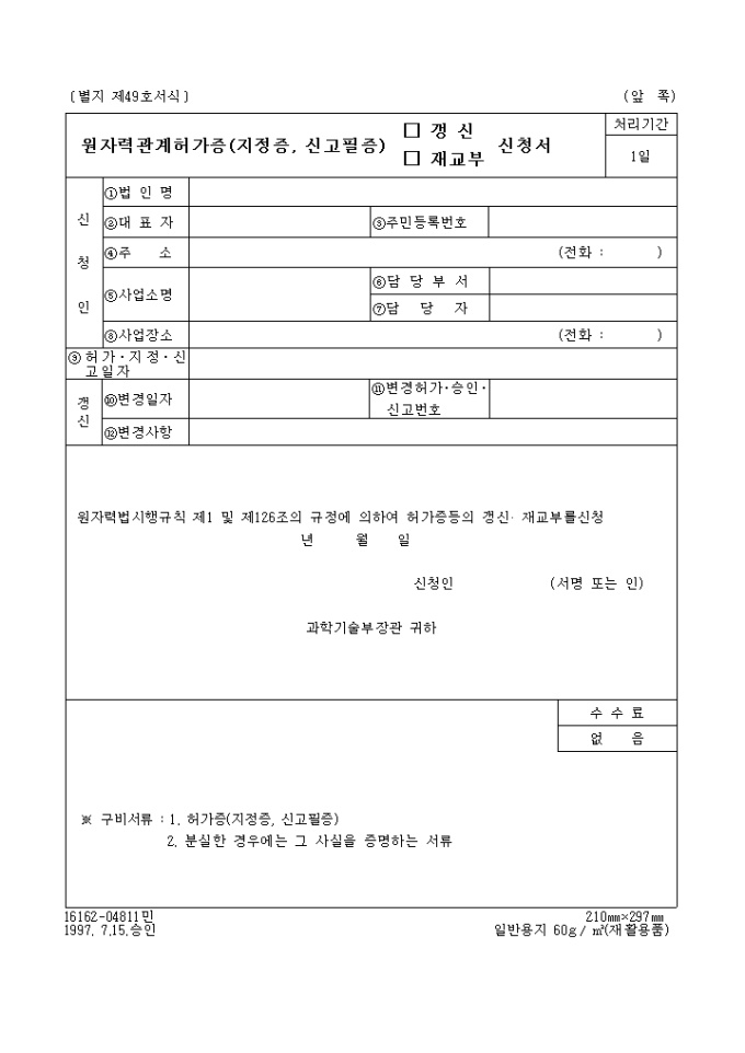 원자력법시행규칙 제1 및 제126조의 규정에 의하여 허가증등의 갱신. 재교부를 신청합니다. 구비서류 명시.
