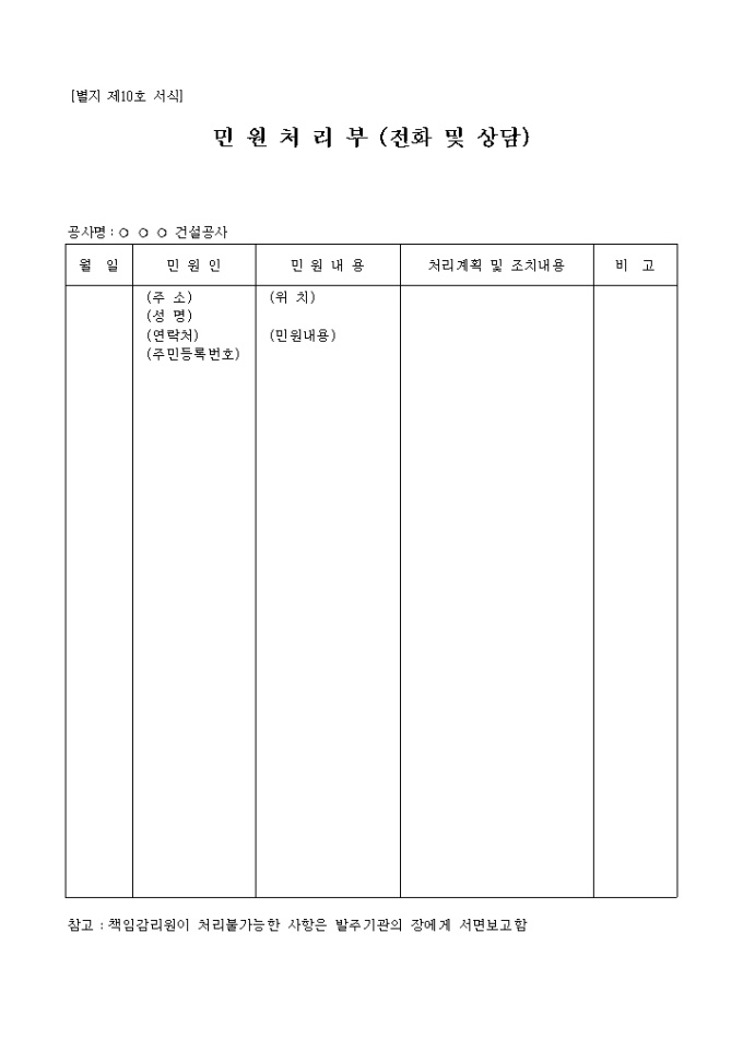 월일,민원인,민원내용,처리계획및 조치내용,비고의 항목으로 구성된 양식입니다.