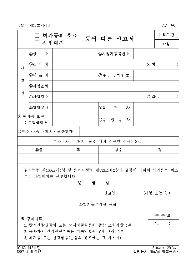 원자력법 제100조제1항 및 동법시행령 제332조제2항의 규정에 의하여 허가등의 취소 또는 사업폐지를 신고합니다.