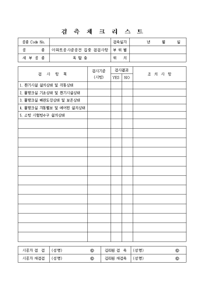 건축기계설비공사준공점검,옥탑충 체크리스트 입니다.