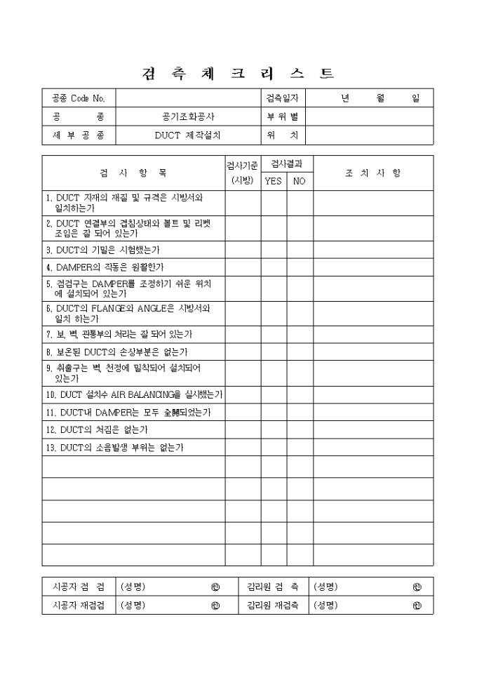 공기조화설비공사,DUCT제작설치 체크리스트 입니다.