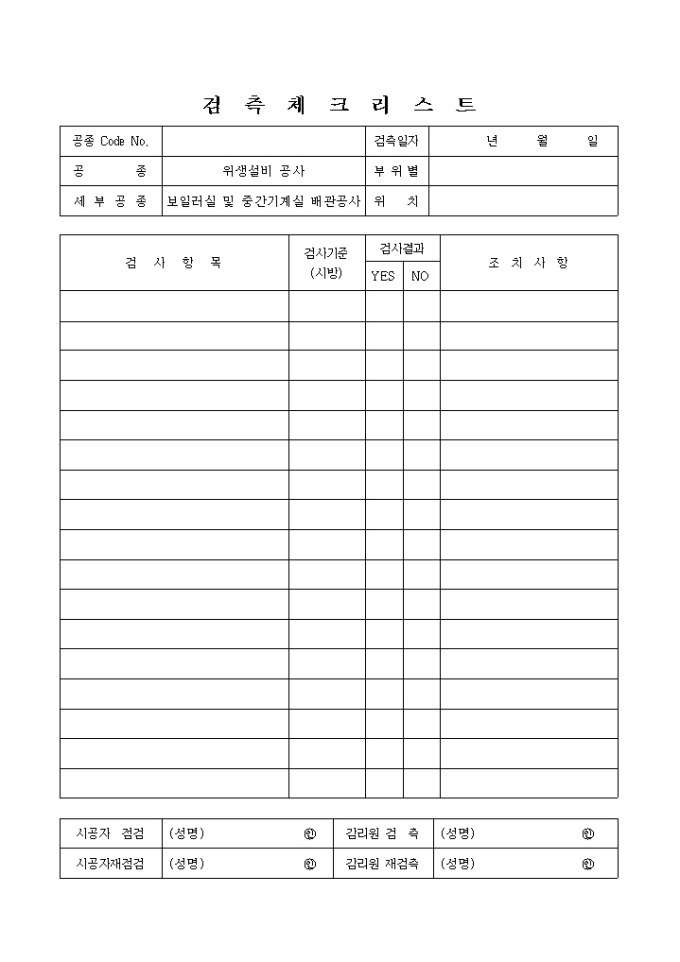 9,000원/월공종 코드번호, 검측일자, 공종, 부위별, 세부공종, 위치, 검사항목, 검사기준, 검사결과, 조치사항을 기록하는 급배수설비위생설비공사,보일러실및중간기계실배관공사 체크리스트 양식입니다.
