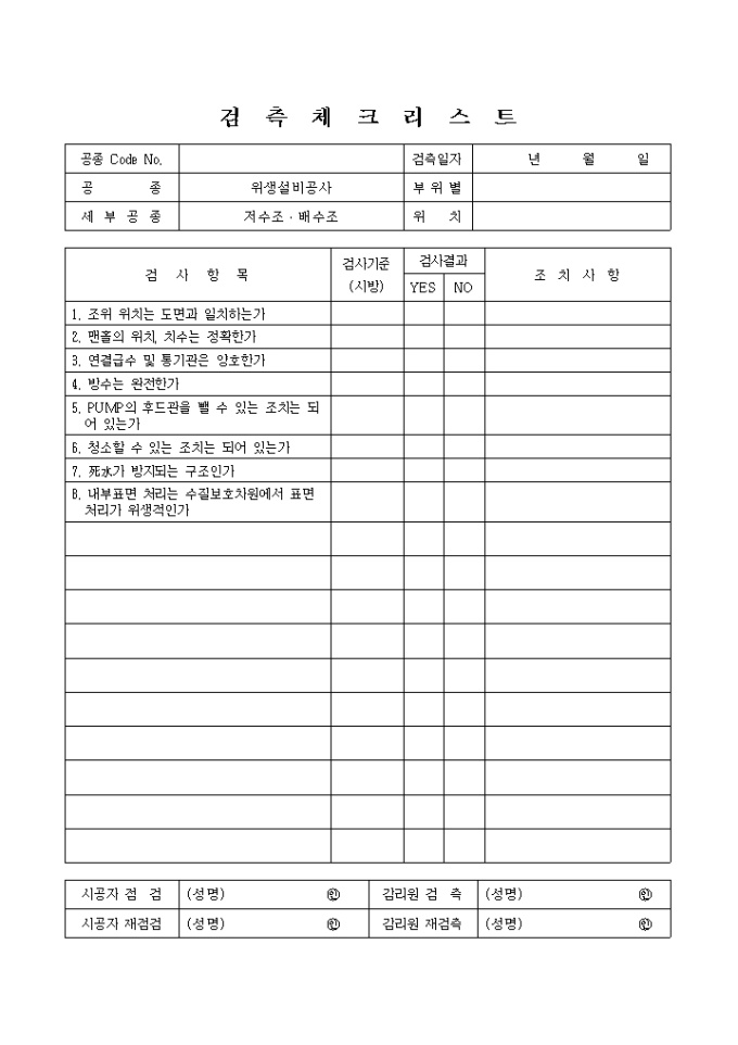 급배수설비위생설비공사,저수조·배수조 체크리스트 입니다.