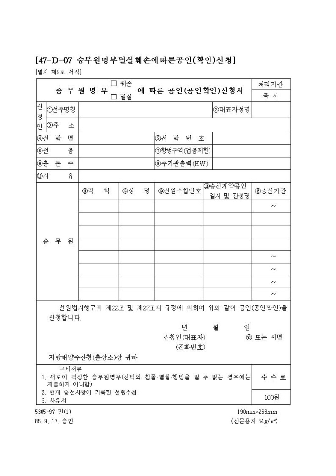 승무원명부(훼손,멸실)에따른 공인(공인확인)신청서
