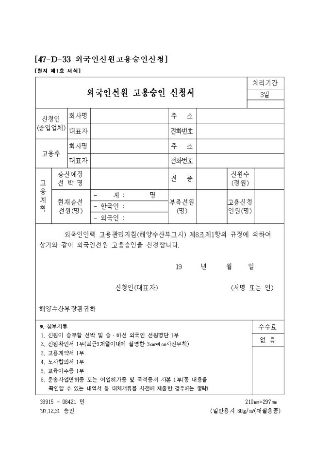 외국인선원 고용승인 신청서