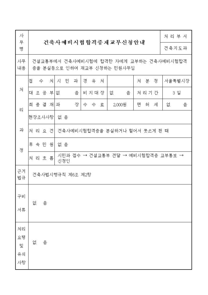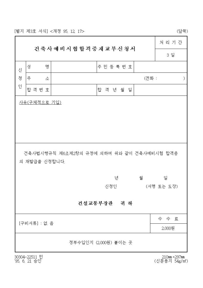 건축사예비시험합격증재교부신청서