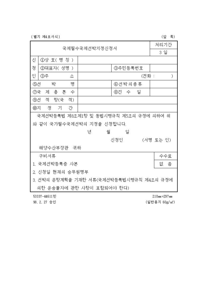 국제필수국제선박지정신청서