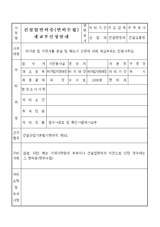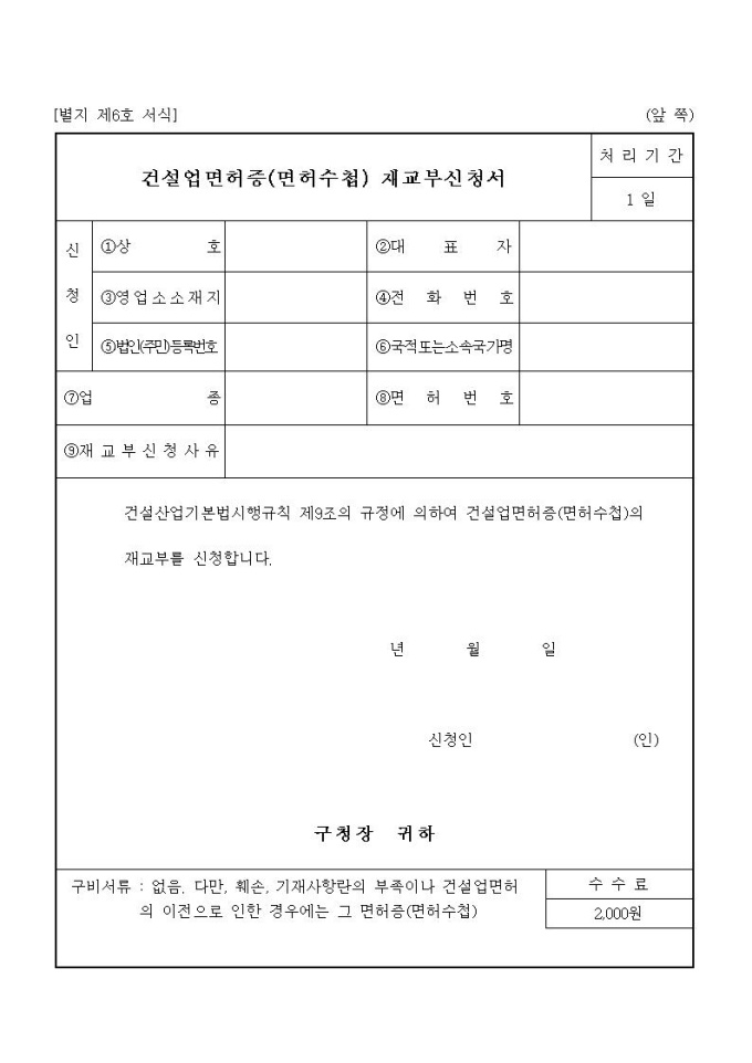 건설업등록증(등록수첩)재교부신청서