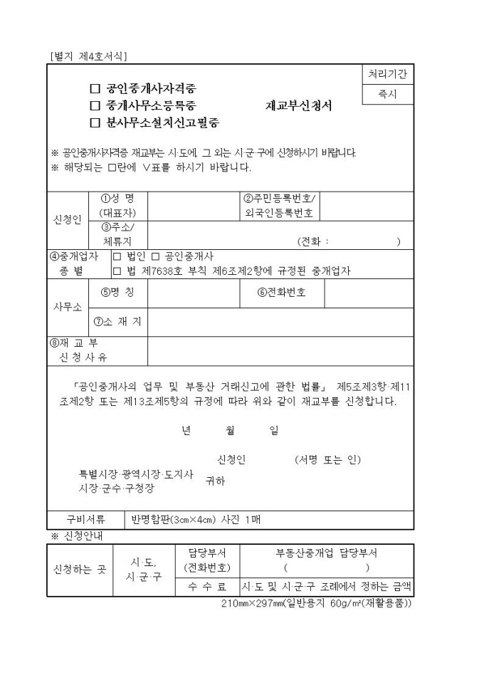 공인중개사자격증, 중개사무소등록증, 분사무소설치신고필증 재교부신청서