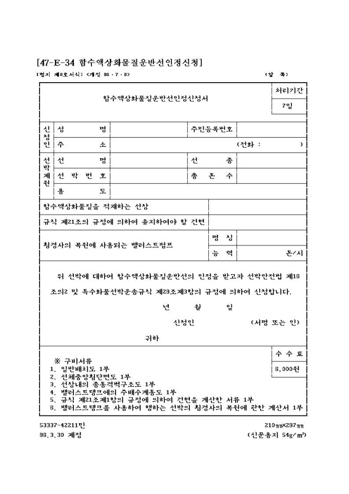 함수액상화물질운반선인정신청서