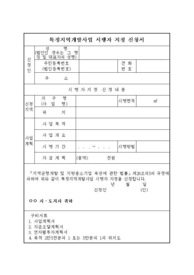 특정지역개발사업 시행자 지정신청서