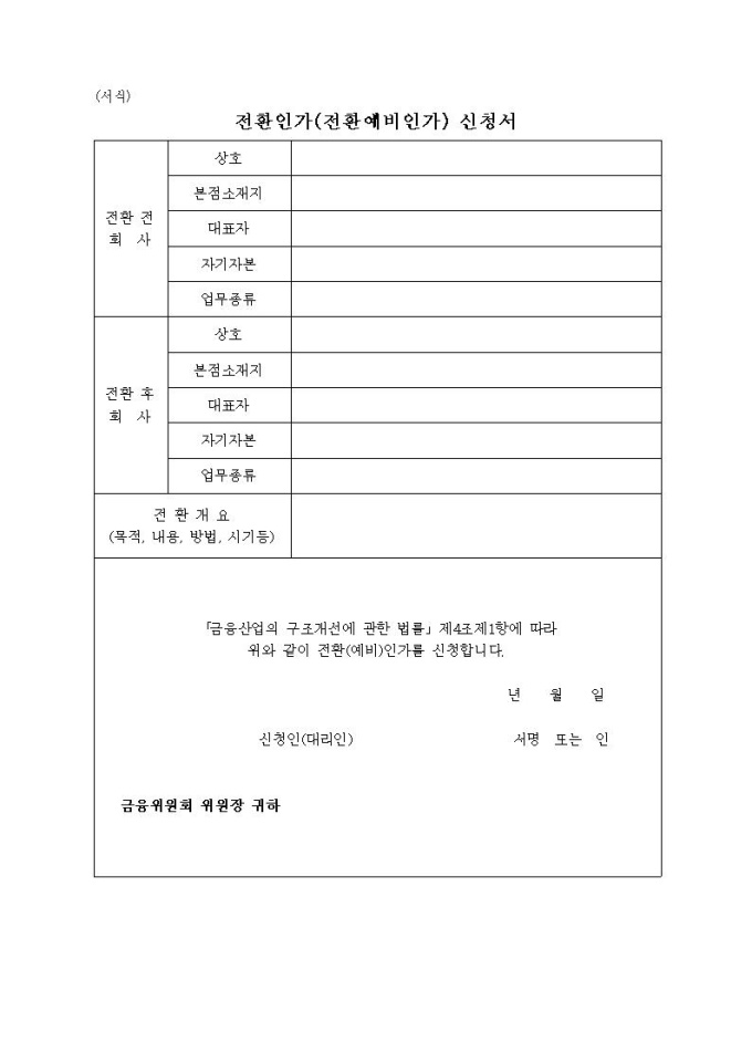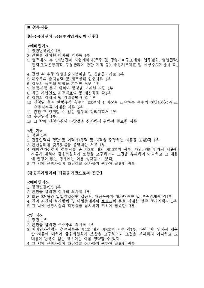 금융투자업자 업종 전환 예비인가(타금융회사→금융투자회사, 금산법)