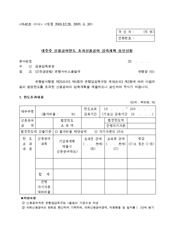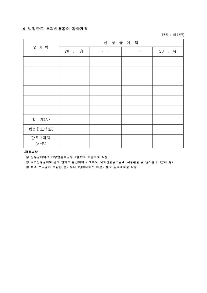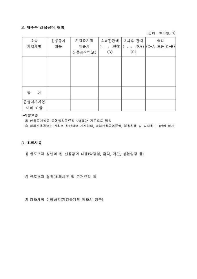 대주주신용공여한도 초과신용공여감축계획 승인신청서