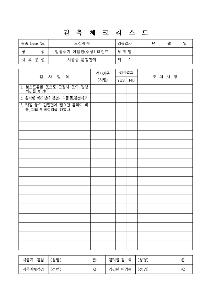 9,000원/월도장공사,시공중품질관리(합성수지에멀전(수성)페인트) 체크리스트 입니다.