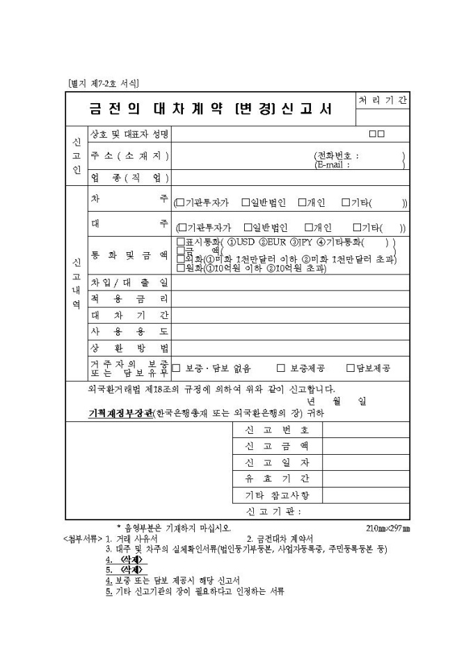 금전의 대차계약(변경)신고 별지서식