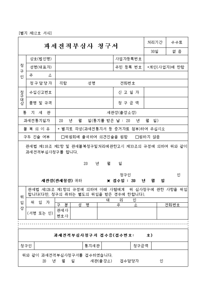관세법 제118조 제2항 및 관세불복청구및처리에관한고시 제33조의 규정에 의하여 위와 같이 과세전적부심사청구를 합니다.