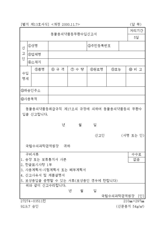 [서식13]동물용의약품등무환수입신고서
