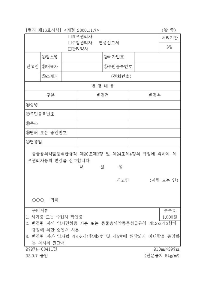 [서식16](제조관리자,수입관리자,관리약사) 변경신고서