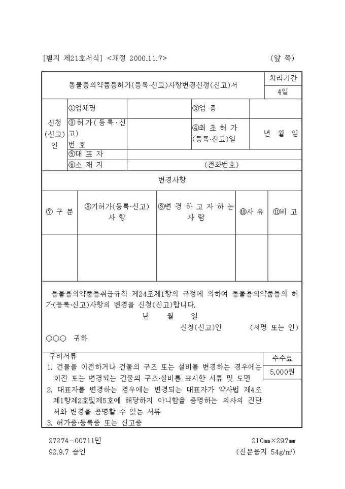 [서식21]동물용의약품등허가(등록·신고)사항변경신청(신고)서