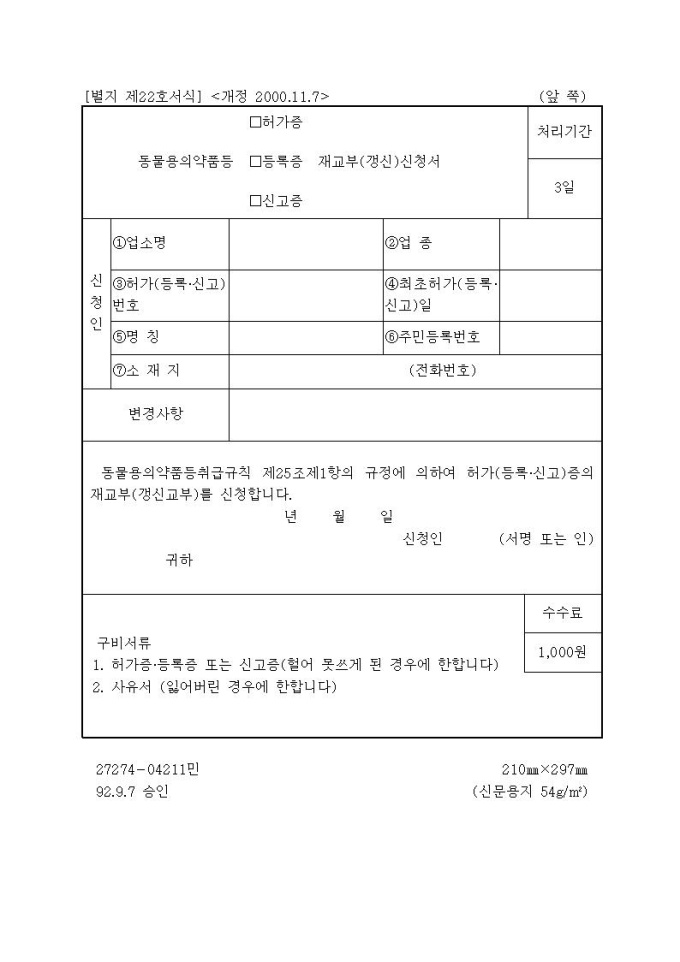 [서식22]동물용의약품등(허가증,등록증,신고증)제교부(갱신)신청서