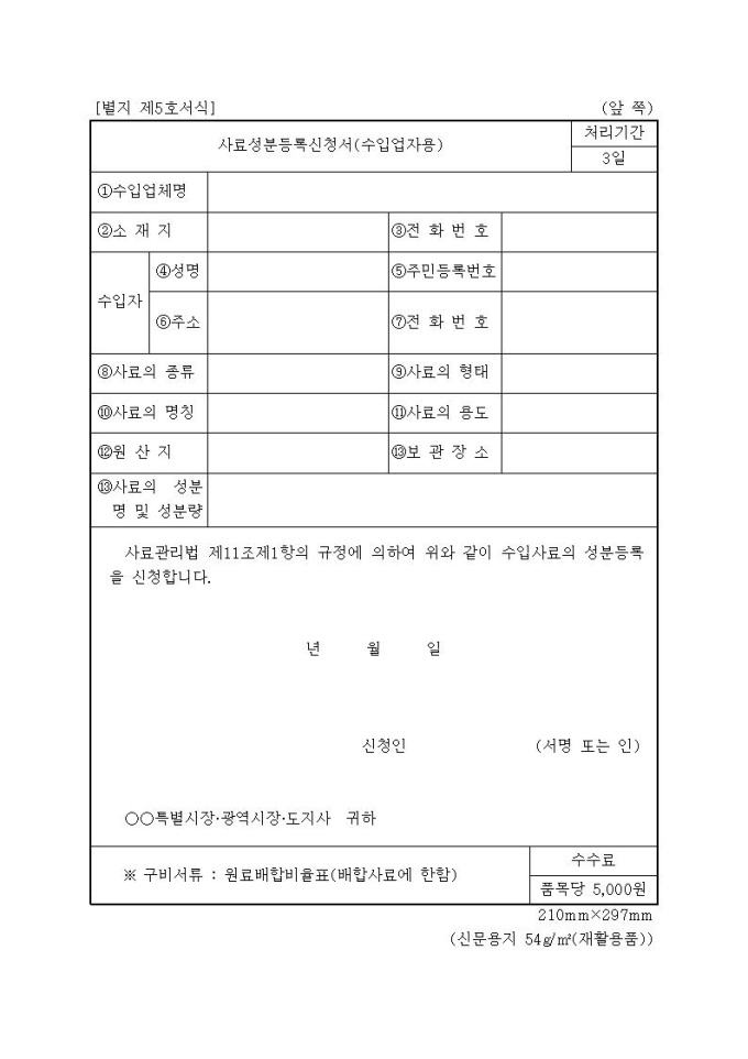 [서식5]사료성분등록신청서(수입업자용)