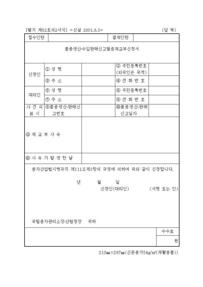 [서식62의 2]품종생산·수입판매신고필증재교부신청서