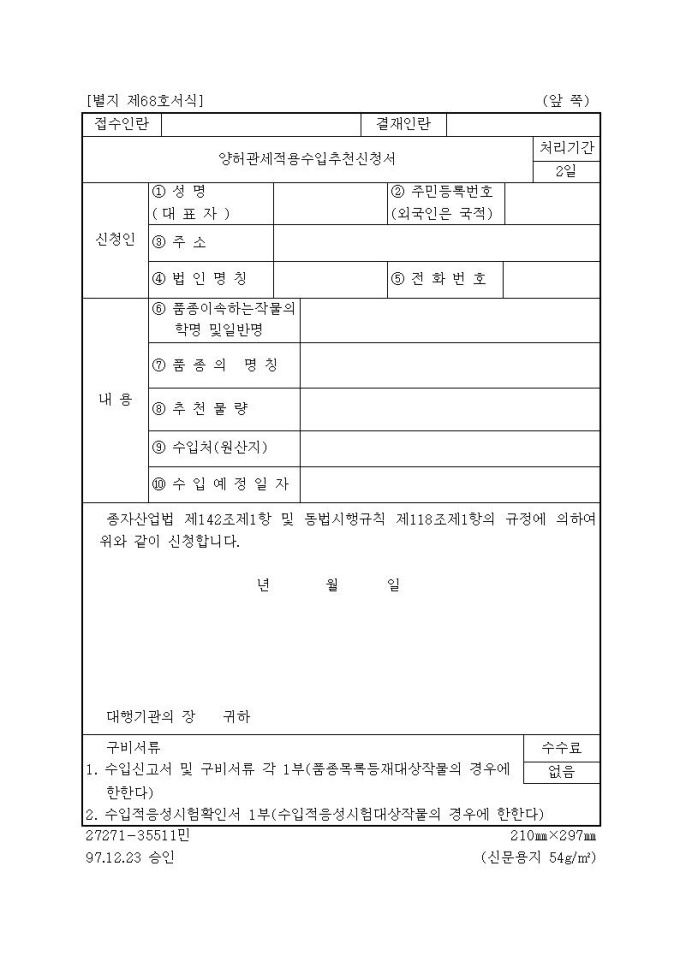 [서식68]양허관세적용수입추천신청서