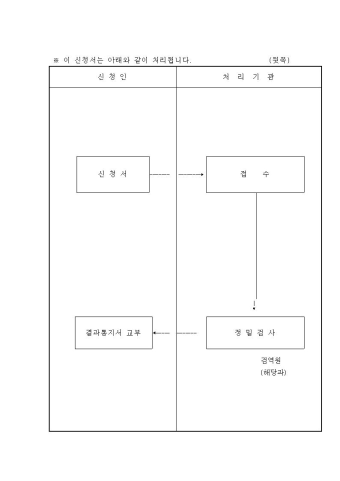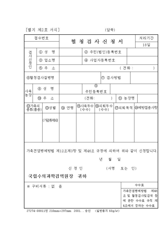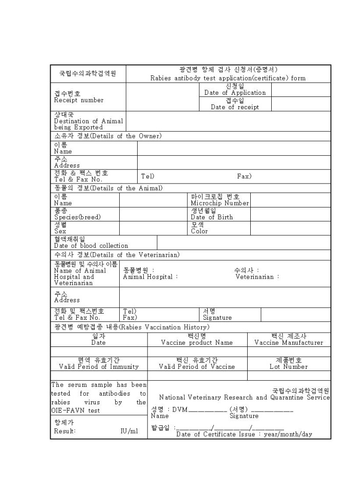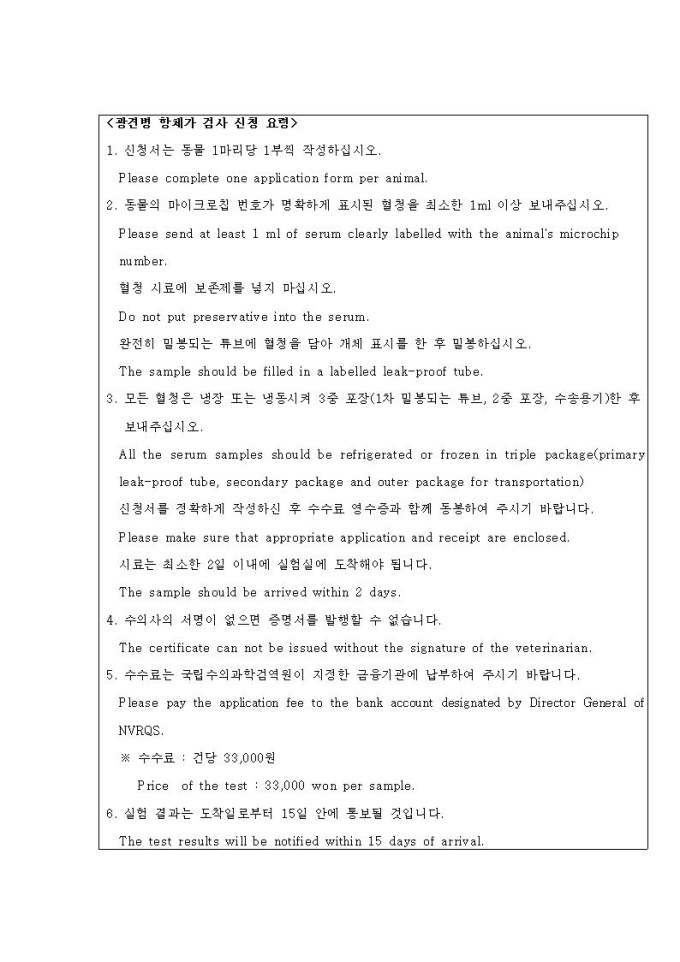 광견병 항체검사 신청서(증명서)1부 또는 혈청검사신청서 1부