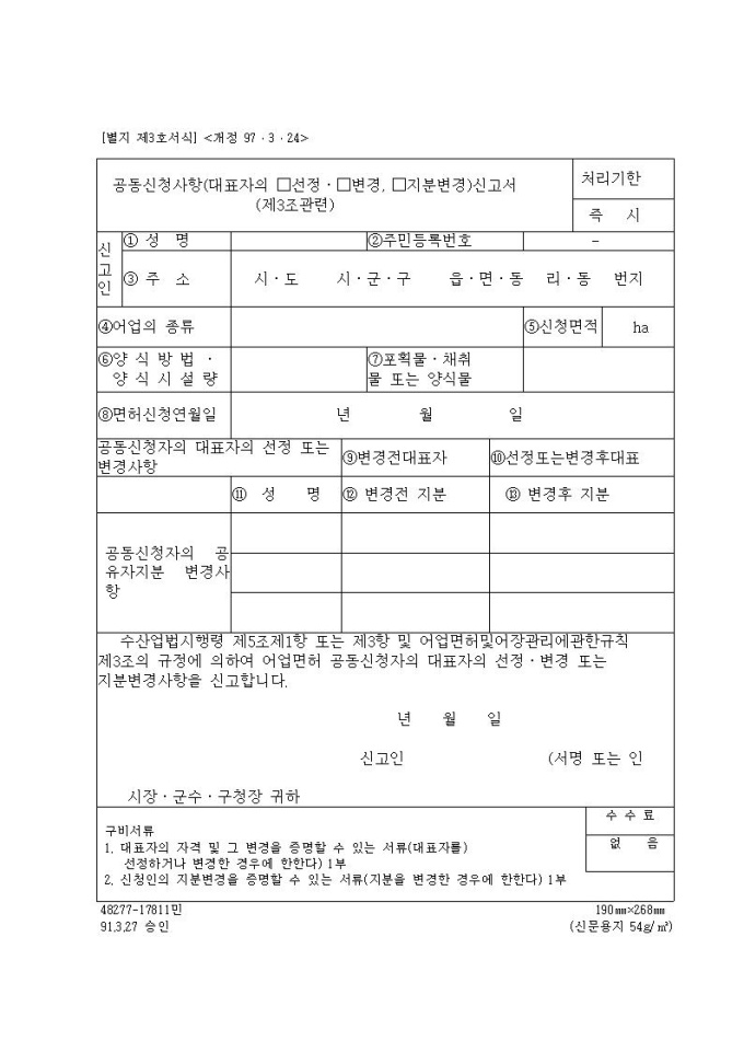 공동신청사항(대표자의 선정,변경,지분변경)신고서(제3조관련)