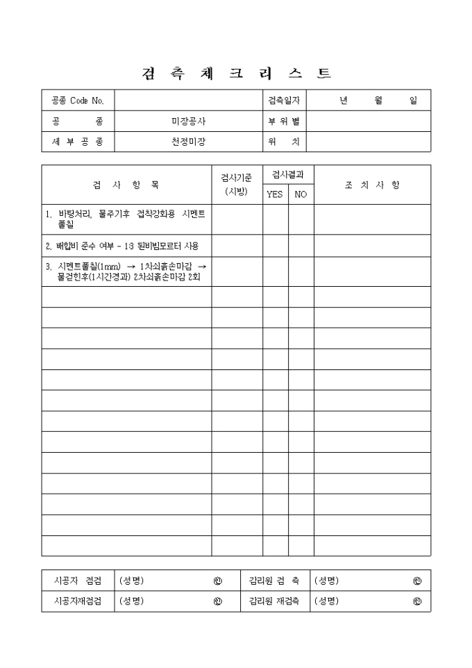 미장견출공사,천장미장 체크리스트 입니다.