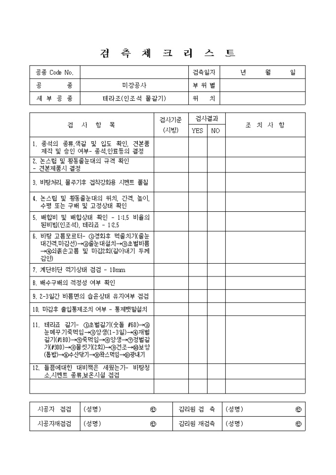 9,000원/월미장견출공사,테라조(인조석물갈기) 체크리스트 입니다. 검 사 항 목 1. 종석의 종류,색갈 및 입도 확인, 견본품 제작 및 승인 여부- 종석,안료등의 결정 2. 논스립 및 황동줄눈대의 규격 확인 - 견본제품시 결정 3. 바탕처리, 물주기후 접착강화용 시멘트 풀칠 4. 논스립 및 황동줄눈대의 위치, 간격, 높이, 수평 또는 구배 및 고정상태 확인 5. 배합비 및 배합상태 확인 - 1:1.5 비율의 된비빔(인조석), 테라죠 - 1:2.5 6. 바탕 고름모르터- ①경화후 먹줄치기(줄눈대간격,마감선)→②줄눈대설치→③초벌바름 →④쇠흙손고름 및 마감2회(갈아내기 두께 감안) ...