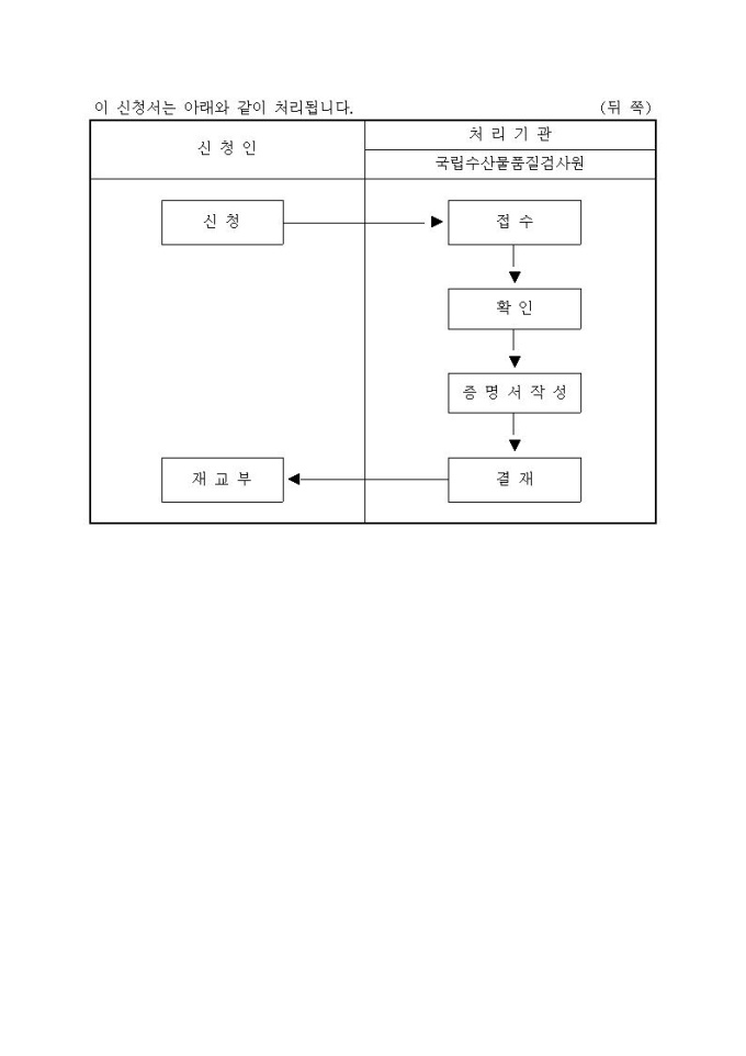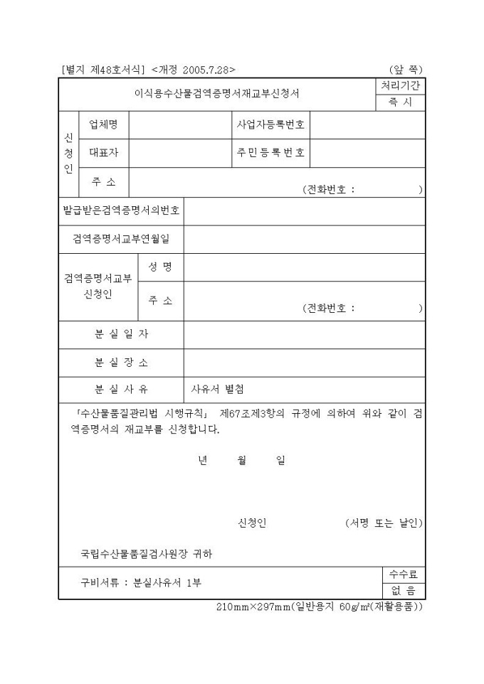 이식용수산물 검역증명서 재교부신청서