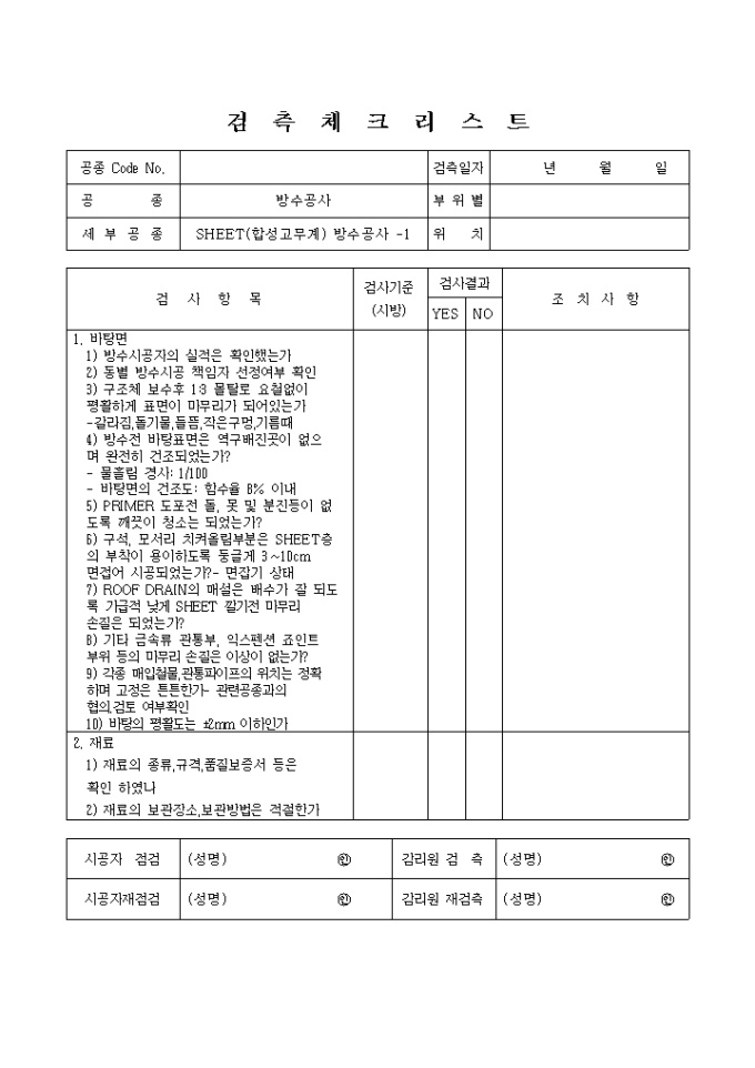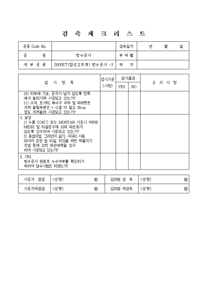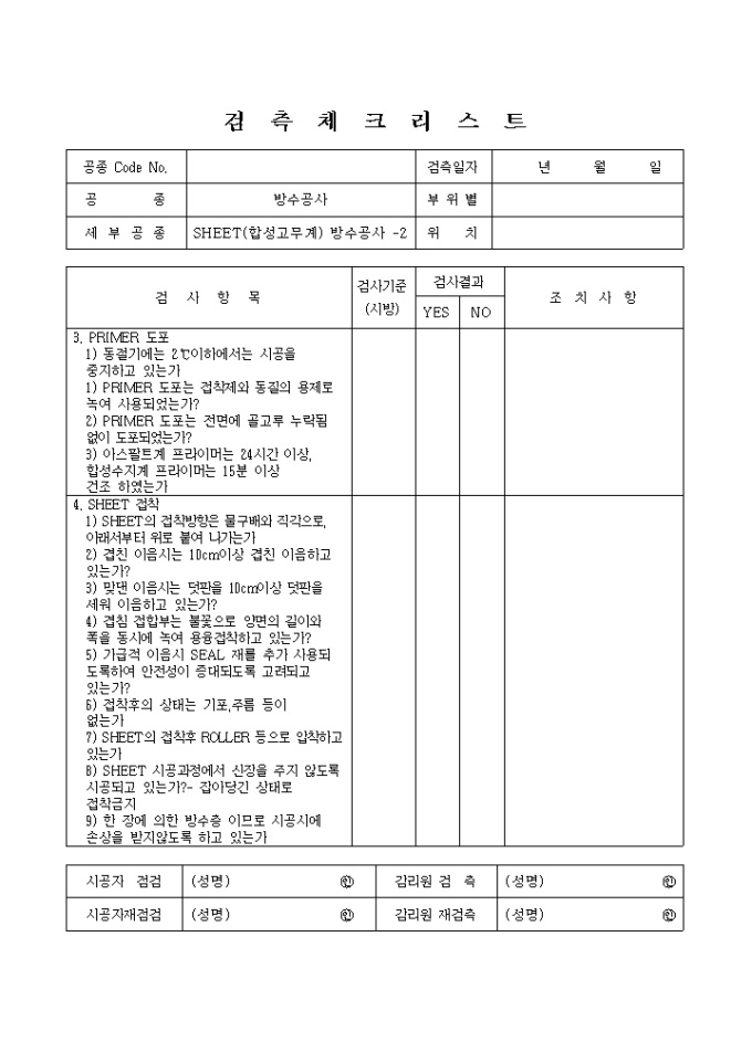방수,방습공사,SHEET(합성고무계)방수공사 체크리스트 입니다.