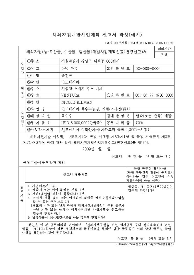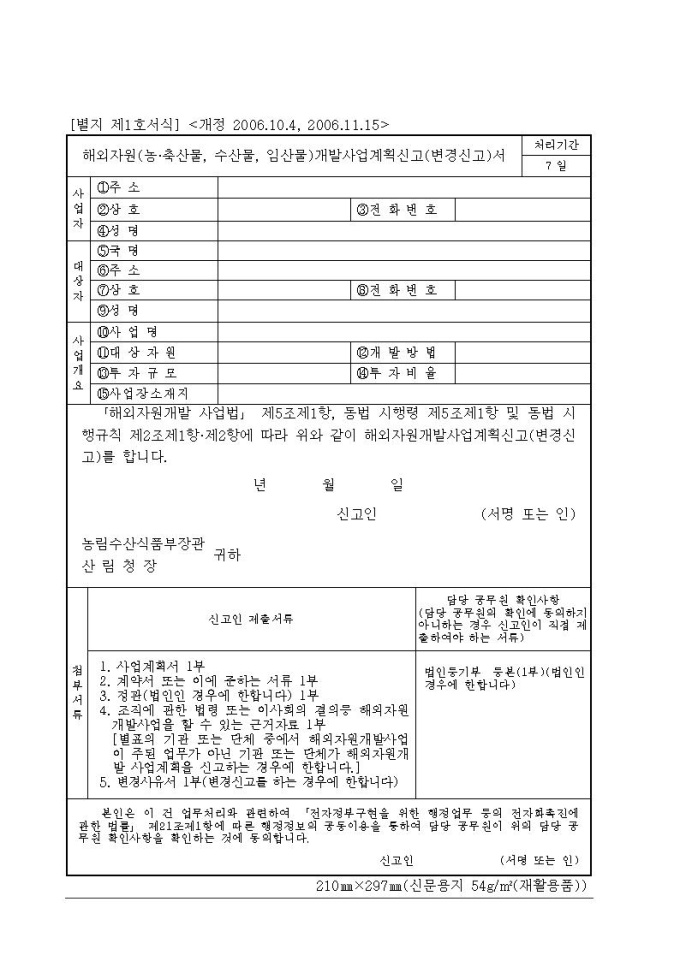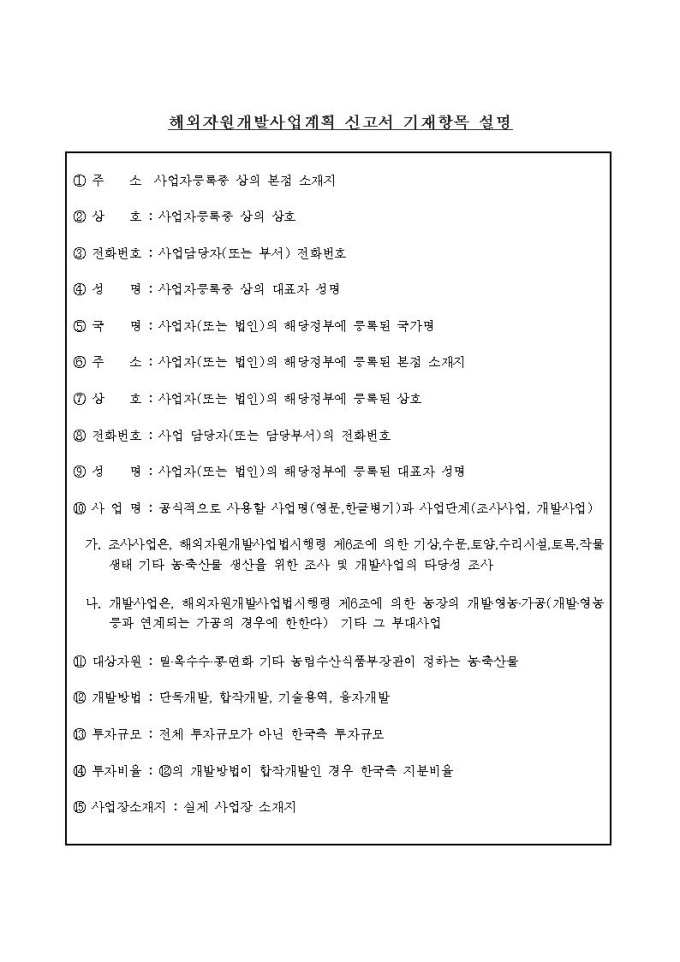 해외자원(농축산물)개발사업계획신고(변경신고)서