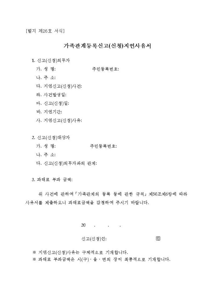 가족관계등록신고(신청)지연사유서(시구읍면사무소 제출용)